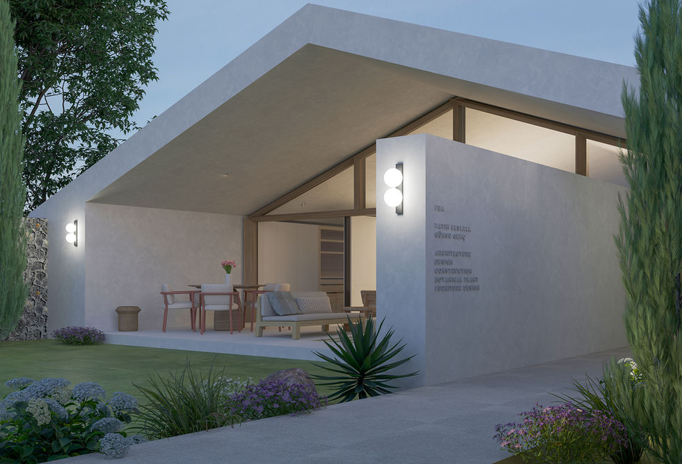 The building’s exterior has a modern and simple design. The light-colored concrete surfaces are balanced with large glass openings, allowing natural light to enter the interior. The sloped roof and symmetrical structure present both a traditional and contemporary aesthetic. The landscaping is completed with minimalist elements, featuring tall, slender trees and stone walls that create a natural harmony. -