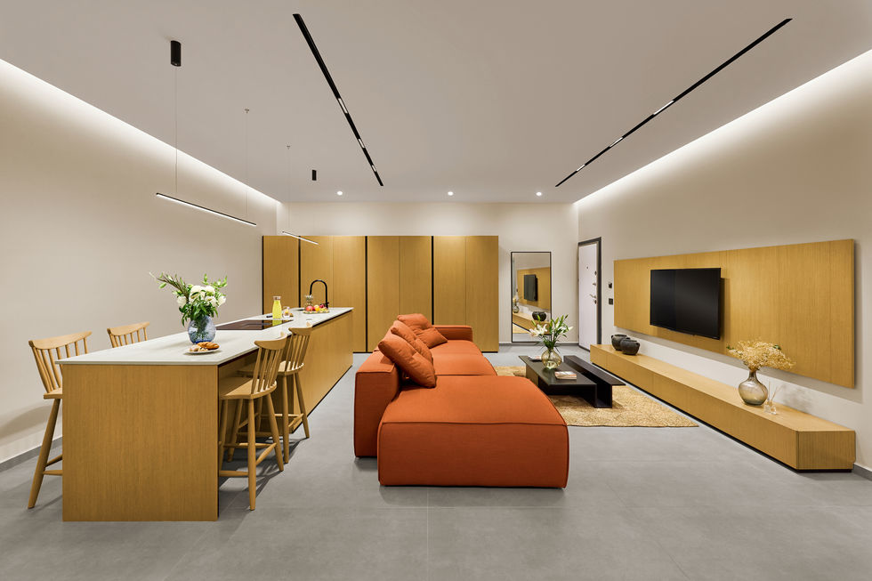Natural materials dominate the palette—light-toned wood claddings, textured stone surfaces, and concrete floors create a serene and warm atmosphere. The color scheme is kept neutral and elegant, with occasional vibrant furniture elements injecting a touch of dynamism.
