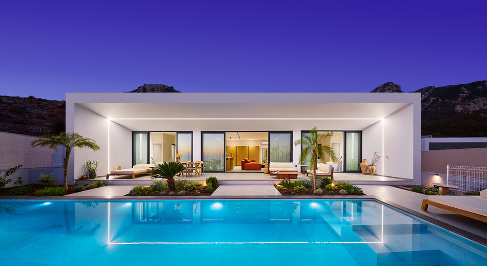 The design is composed of a single-story, horizontally stretched mass that harmonizes with the terrain. The façade features pure geometric forms and uninterrupted surfaces, reinforcing the minimalist aesthetic. Large openings establish a seamless visual and functional connection between interior and exterior, making the panoramic view an integral part of the living experience.
